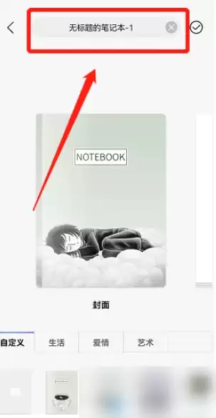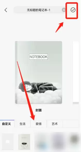 第四步,从图库中挑选心仪的图案作为笔记本封面,并点击右上角对勾图标确认选择。操作示意如下: