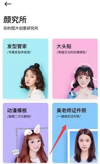 *先打开手机里的美颜相机手机软件,进到到主页以后开启里边的颜究所,如下图开启颜究所网页页面以后,在网页页面就可以见到有一个证件照片,点击打开,如下图点击打开证件照片以后,网页页面正