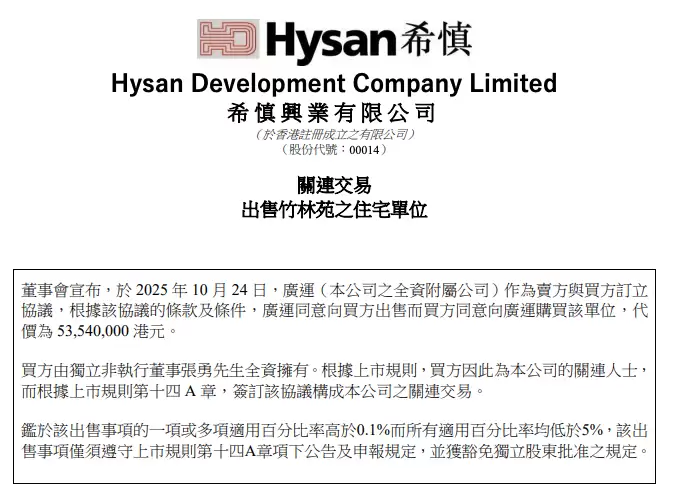 香港上市公司希慎兴业近日发布的一则公告引发市场关注。根据公告披露,其全资子公司广运于10月24日与买方达成一项住宅交易协议,将出售位于香港半山坚尼地道黄金地段的竹林苑一处住宅单位。该住宅实用面积约2084平方呎(折合193平方米),成交金额达5354万港元。