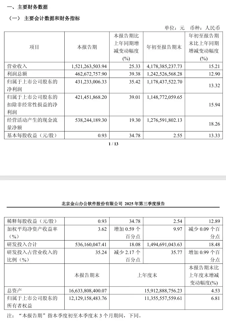 金山办公2025Q3营收15.21亿元 同比增长25.33%