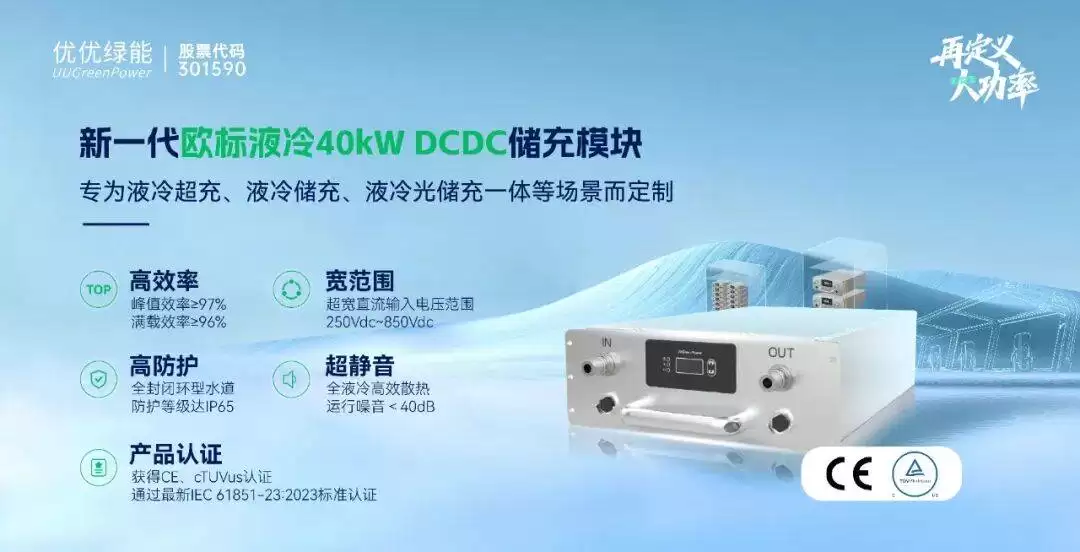 针对高防护、高可靠性场景需求,优优绿能于2025年推出采用第二代液冷技术的40kW欧标液冷DC/DC储充模块。该模块与40kW液冷AC/DC模块尺寸完全统一,支持灵活部署,可有效降低系统结构成本。其IP65防护等级能适应各类严苛环境,充分满足大功率储能充电场景的严苛要求。公司通过优化模块设计,使AC/DC与DC/DC模块效率分别达到97%峰值和96%满载,大幅降低电能损耗。
