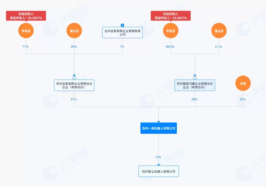 方宇虽未直接点明"后方"决策者,但从公司股权结构来看,这个"后方"很可能就是吉利。一星机器人董事长潘运滨同时也是吉利半导体公司的CEO。吉利系人员在一星机器人中占据举足轻重的地位。天眼查的股权穿透图显示,一星机器人的实控人为李星星,持股比例65.66%,拥有51%的表决权。