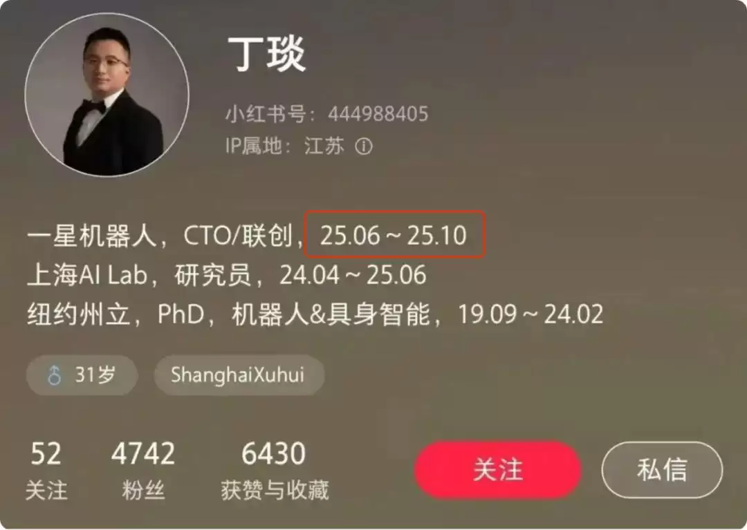 这家初创企业原本组建了堪称豪华的团队——上海AI Lab的明星研究员丁琰,复旦大学姜育刚教授团队、清华大学汪玉教授团队以及国际知名的FastUMI数据采集团队都被招至麾下。在"不差钱"又背靠吉利这棵大树的情况下,一星机器人的解散完全超乎市场想象。不过,一星机器人CTO兼联合创始人丁琰的社交平台却证实了解散一事并非空穴来风。其个人小红书账号关于在一星机器人的任职经历明确标注为2025年6月至2025年10月,时间上完全吻合。