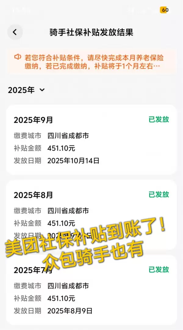 美团骑手养老金补贴提前两月发放,覆盖全部骑手