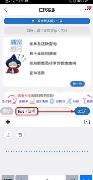 在在线客服对话框中输入“信用卡注销”,然后点击发送按钮。