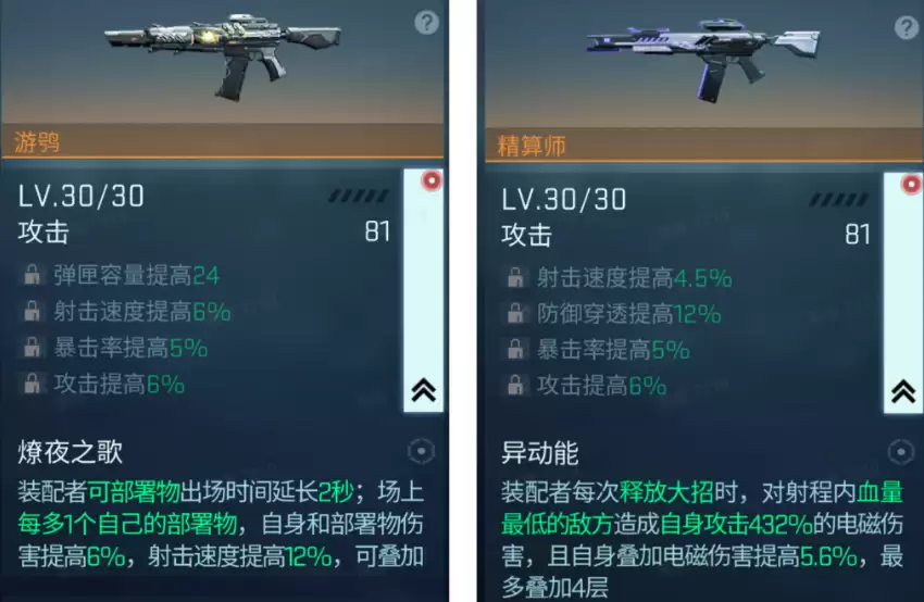 在众多武器中,尤为出色的两把SSR级武器——"游隼"和"精算师",堪称输出利器。"游隼"搭载的专属技能"灼夜之歌",可使装配该武器的角色延长可部署物在场时间2秒,并在战斗场景中额外获得一个部署位。角色自身与部署物的伤害均提升6%,射击速度提高12%,且此状态可叠加;而"精算师"则具备独特的"异动能"效果,装配该武器的角色每次释放大招时,均可对射程范围内生命值最低的敌人造成高达432%的自身电磁攻击伤害。角色在叠加电磁伤害后,会额外提升5.6%伤害,最高可叠至四层。随着更多配件解锁,"游隼"与"精算师"都将展现出更强大的作战能力。