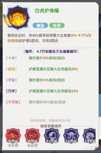 受到攻击时,有40%概率获得等同于最大生命值15%+(年份加成)的护盾,持续2回合,冷却时间2回合。
