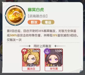 自第2回合起,每回合开始时有35%概率发动,对敌方全体造成500%总攻击的特殊伤害,并降低15%普攻减伤,持续3回合。整场战斗仅可触发一次。