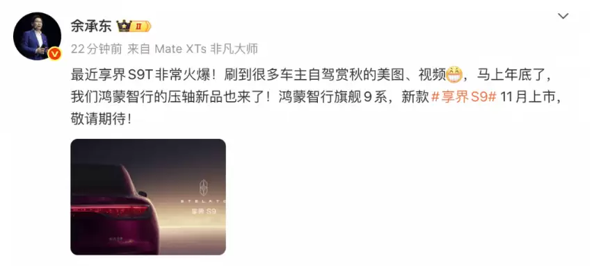 华为常务董事、终端BG董事长余承东近日通过社交平台宣布,鸿蒙智行旗下旗舰9系车型——新款享界S9将于11月正式登陆市场。这款定位于高端新能源领域的车型,延续了华为在智能终端领域“高端化、智能化”的核心战略,进一步强化了鸿蒙智行在豪华汽车市场的竞争力。