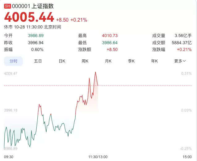 今天A股市场迎来强劲表现,三大股指集体上演低开高走行情。早盘阶段市场情绪偏向谨慎,指数均呈现小幅低开态势,不过随着多头力量迅速集结,推动指数持续攀升。临近上午交易时段中段,上证指数成功突破4000点整数关口,这是该指数自2015年8月19日以来首次重返这一重要心理价位,距离上一次站上4000点已间隔整整十年。