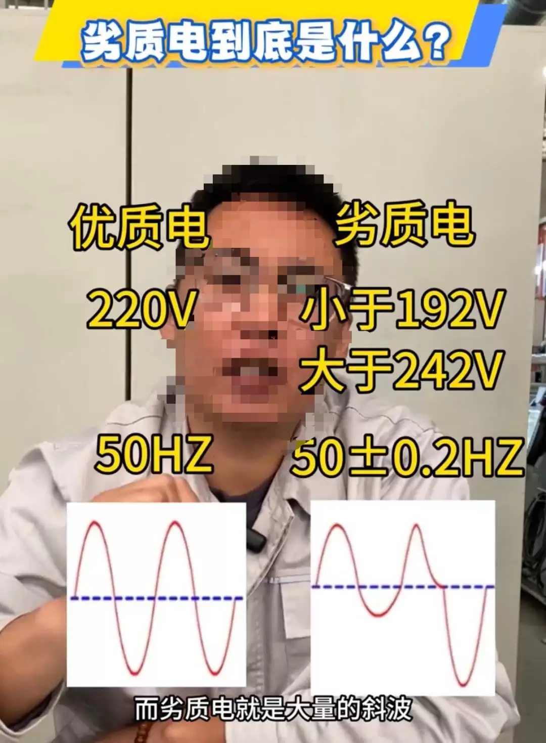 "优质电"的电压稳定在220V;电力频率维持在50HZ;波形畸变保持正弦波。而电压低于192V或高于242V;电力频率偏离50正负0.2HZ;波形畸变出现大量谐波,则属于"劣质电"范畴。