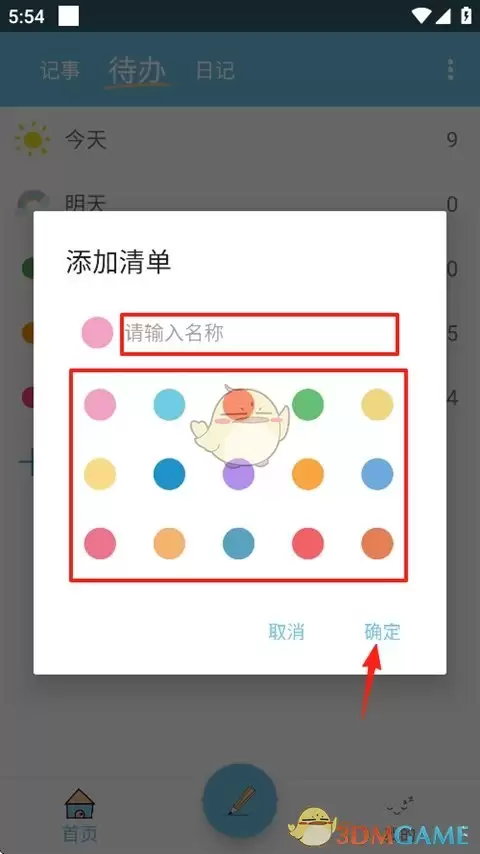 2、接着分别为清单设置名称并选择喜欢的外观颜色,完成后点击确认按钮。