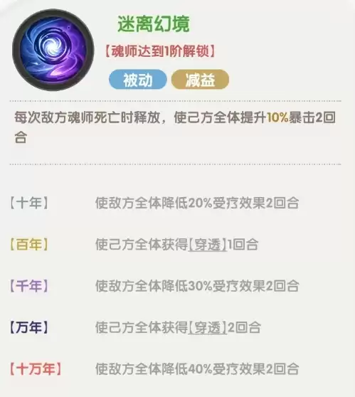 她的第一项被动效果,能在敌方魂师阵亡时触发,使我方全体暴击率获得提升,持续两回合,同时额外附加降低治疗效果与穿透增益。穿透效果在面对拥有护盾的目标时,可造成额外伤害并直接突破护盾防御,这对限制敌方的治疗魂师与前排肉盾有着极强的针对性。第二项被动则是在胡列娜自身被附加减益状态时,能将效果直接反弹给敌方,并且在触发后还有概率立即释放一次主动技能并附加流血效果。这一机制使胡列娜不惧对方的控制技能,在竞技过程中具有显著优势。