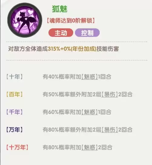 胡列娜的主动技能“狐媚”,不仅能为敌方全体施加技能伤害,还有一定概率附加魅惑与易伤两种强力效果。一旦达到十万年魂环等级,魅惑触发概率将提升至80%,易伤效果同样达到80%的触发率,且两个状态均可持续两个回合。被魅惑的敌人将完全丧失行动能力,期间受到的所有伤害将无视防御,并在承受两次攻击后状态解除;而易伤效果则能显著提升目标受到的攻击伤害,这两种效果的叠加能够大幅加重对手承受的伤害,对强化我方整体输出具有极大帮助。