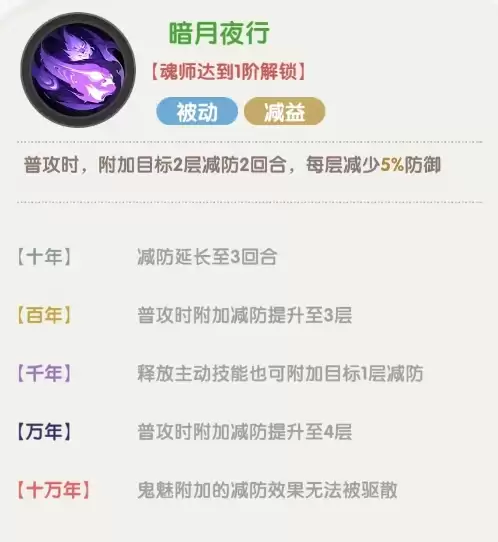 第一个被动技能暗月夜行,能在普攻时为目标附加两层减防效果,每层可降低5%的防御。在魂环年限提升后,释放主动技能也能额外附加减防,最多能叠加到4层,且无法被驱散。降低了对方的防御,队伍中的其他角色自然就能打出更高的伤害了。