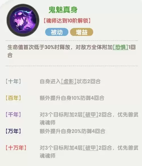第二个被动技能的效果是发动普攻后,对敌方随机一个目标再进行一次追击。提升魂环年限后,能额外附加减防,并对兽武魂魂师造成的伤害进一步提升。最后一个被动技能鬼魅真身,在血量首次低于30%时会自动释放真身,对敌方全体附加一回合的恐惧效果,让对手的输出大幅减少。同时自身进入虚影状态,不仅额外提升了防御,还能给多个目标附加破甲。这个技能的效果相当全面,既增强了自身的生存能力,又削弱了对方的防御,为后续的爆发输出创造了条件。