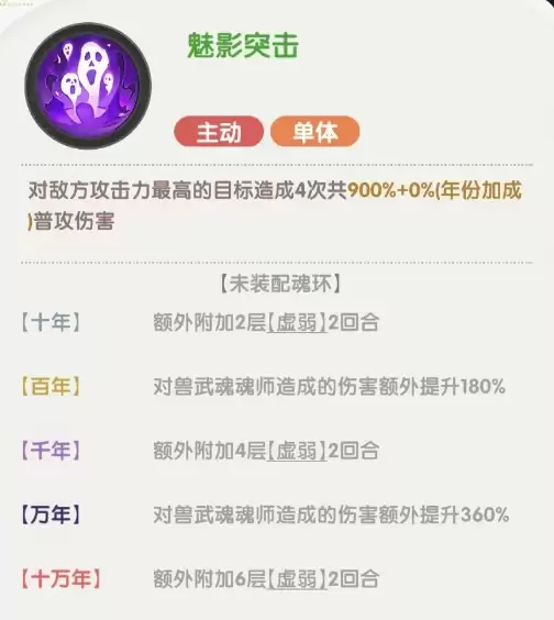 鬼魅的主动技能魅影突击,能够锁定敌方攻击力最高的目标进行多段打击。当魂环年限提升后,还会附加虚弱效果,被削弱的敌人攻击力将明显下降。值得注意的是,鬼魅对兽武魂魂师能造成额外伤害,大家在实战中可以好好利用这一点。如果对方阵容里有兽武魂魂师,那么派出鬼魅出战将会是明智的选择。