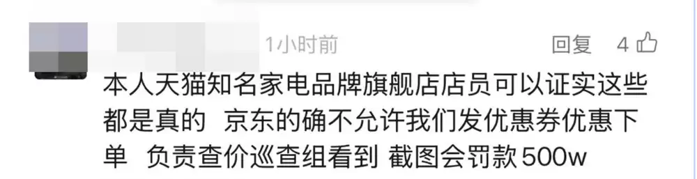 就在这份罚款单被曝光的同时,有网友在媒体报道京东此次"二选一"的新闻下发布评论,声称"本人可以证实都是真的,京东确实不允许我们发优惠券下单,负责查价巡查组看到,截图就会罚款500万"。
