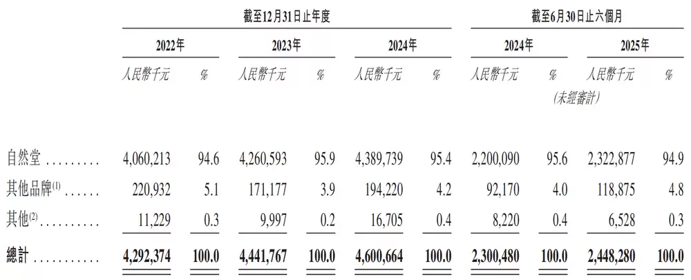 值得注意的是,旗舰品牌"自然堂"贡献了绝大部分营收。2023年至2025年上半年,旗舰品牌"自然堂"贡献收入分别为40.60亿元、42.61亿元、43.90亿元和23.23亿元,占营收的比例分别为94.6%、95.9%、95.4%和94.9%。"自然堂"收入占比常年超过九成,反映出自然堂对单一品牌的依赖程度之高,也反映出其他品牌的收入贡献微乎其微。