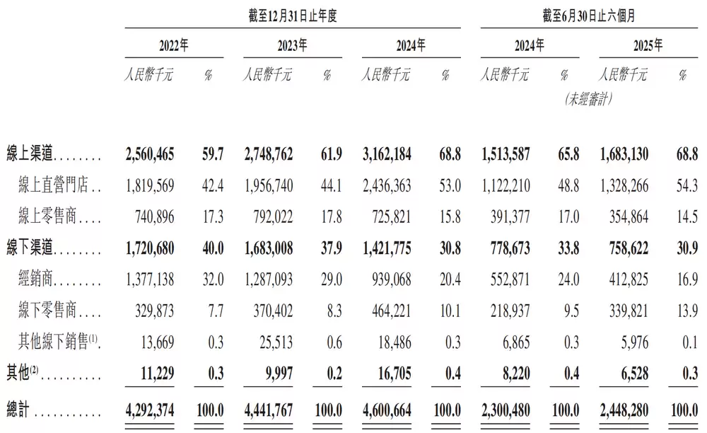 线上销售渠道占比过高是另一大隐忧。自然堂依靠第三方线上平台进行产品销售,包括天猫、抖音、京东、拼多多、快手、小红书、唯品会及微信视频号等。2023年至2025年上半年,自然堂来自线上直营门店的收入分别为18.20亿元、19.57亿元、24.36亿元和13.28亿元,占营收的比例分别为42.4%、44.1%、53.0%和54.3%,呈现逐年增长的趋势。如果再加上线上零售商贡献的收入,那么线上渠道收入占比分别高达59.7%、61.9%、68.8%和68.8%,可见线上渠道已成为自然堂业绩增长的关键支撑。