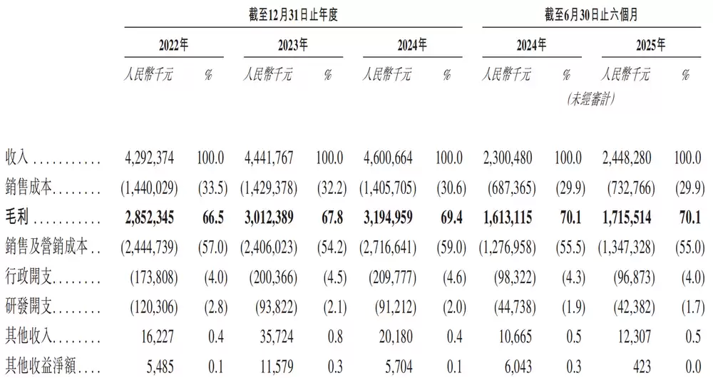 根据招股书,营销及推广开支是自然堂销售及营销成本的主要构成部分。2023年至2025年上半年,营销及推广开支占销售及营销成本的比例分别为70.0%、71.5%、75.8%和77.5%,呈现持续增长态势。