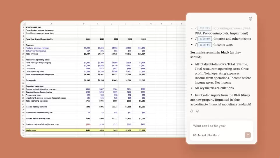 Anthropic推出的Claude for Excel目前处于研究预览阶段,金融分析师可在Excel侧边栏与AI进行实时协作。Claude能够直接读取、分析与修改现有工作簿,或从零开始生成全新表格,其核心优势在于对复杂数据逻辑的精准把控:用户更新假设参数时,AI会自动保留公式依赖关系,并可调试修复单元格公式、高效填充数据模板。