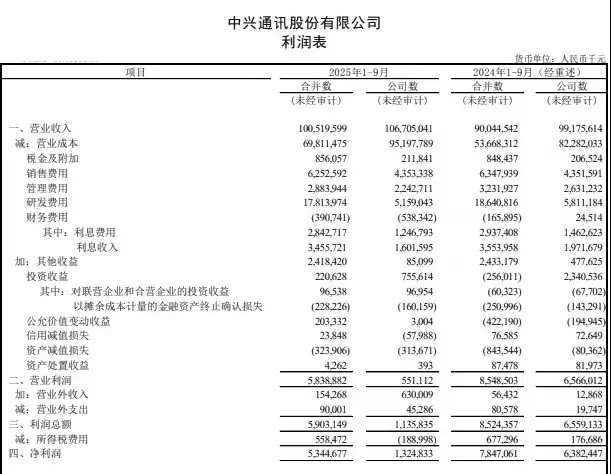 中兴通讯2025年Q3净利2.64亿元,同比下滑87.84%