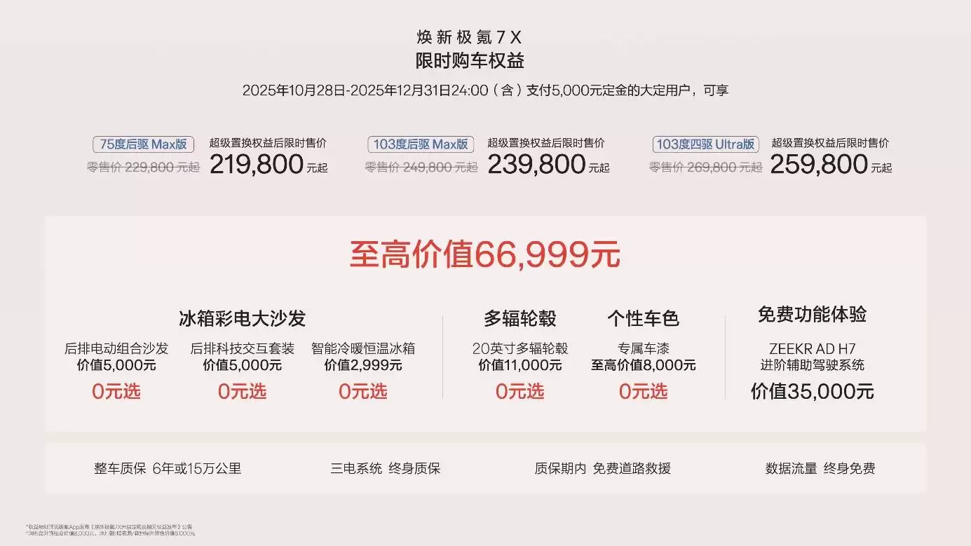 极氪汽车旗下豪华SUV焕新之作极氪7X日前正式推向市场,共推出三款配置车型:75度后驱Max版、103度后驱Max版及103度四驱Ultra版,官方指导价格区间为22.98万至26.98万元。配合上市置换权益,消费者可享限时优惠价21.98万至25.98万元。品牌同步推出总价值最高达69999元的选装礼包、终身质保服务及浩氪H7高阶辅助驾驶终身免费体验等专属权益,进一步强化产品竞争力。