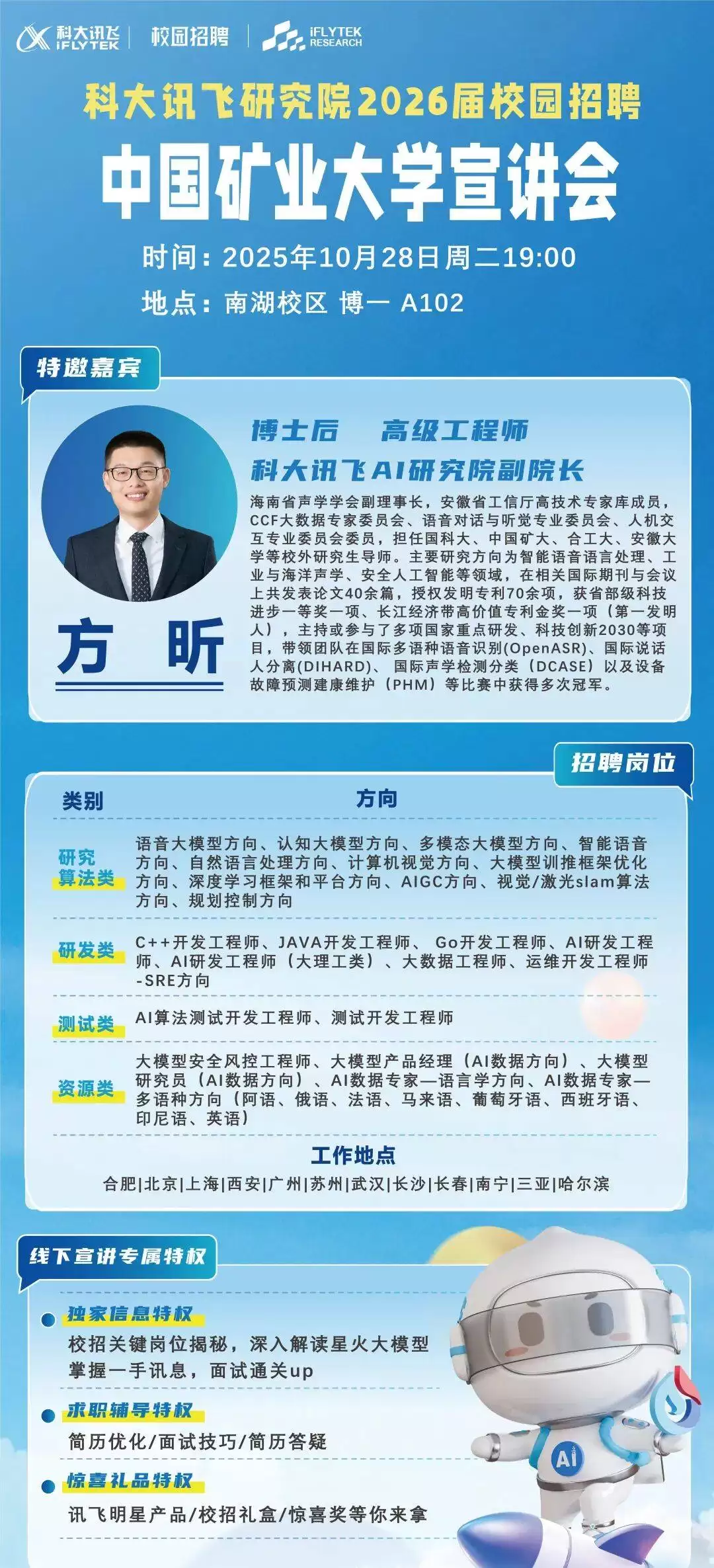 科大讯飞2026校招来袭!10月28日南湖校区博学A102宣讲