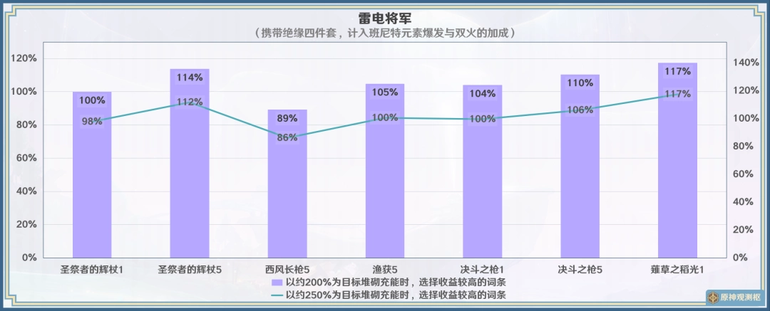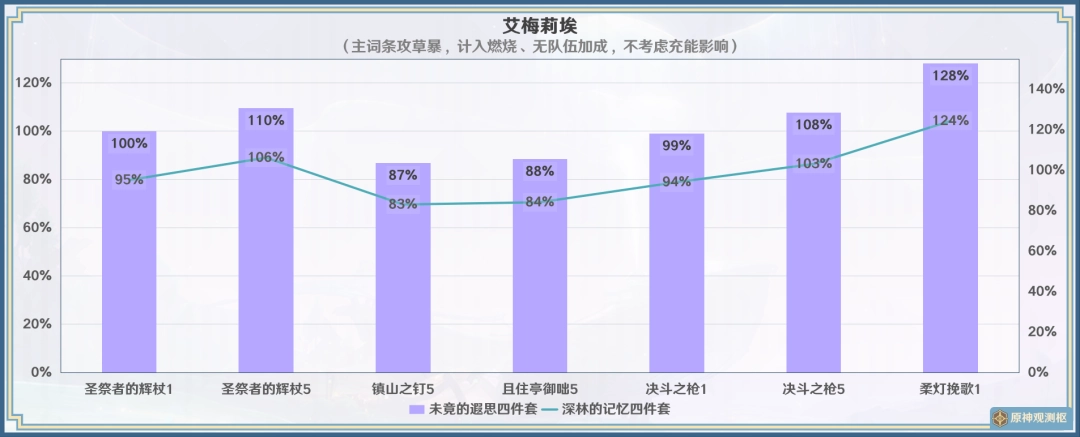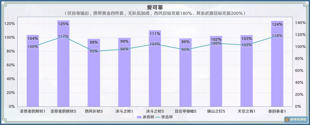 • 图表结果为不考虑充能收益,艾梅莉埃通常不需要顾及太多充能,不过实际情况可能有优化战斗体验的作用。此时相对精5的「且亭御箓」根据精炼情况提升约13%~23%,与同精炼的「决斗之枪」表现接近。