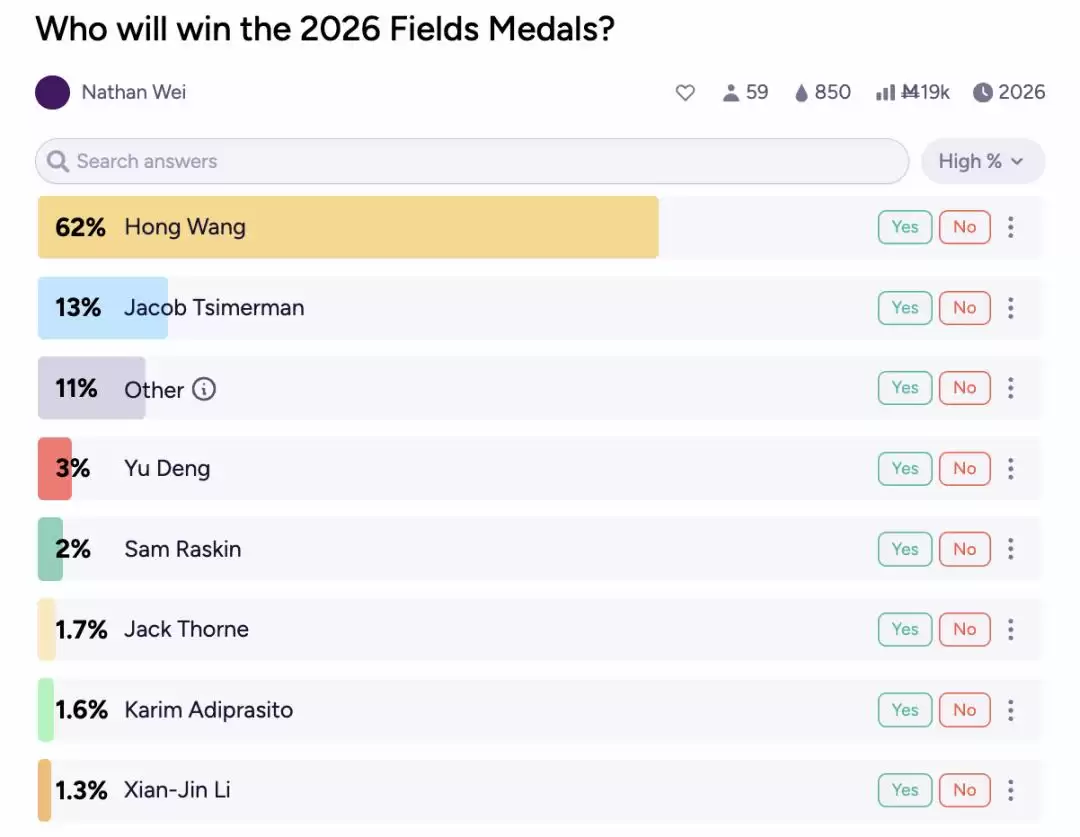 此前,王虹一度登上2026菲尔兹奖得主赔率榜榜首