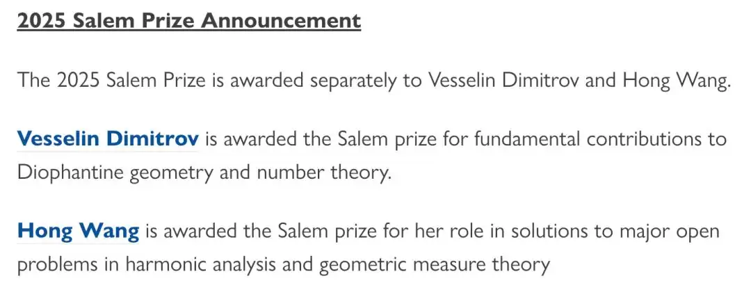 今天,34岁的中国数学家王虹,成功拿下了2025年塞勒姆奖。