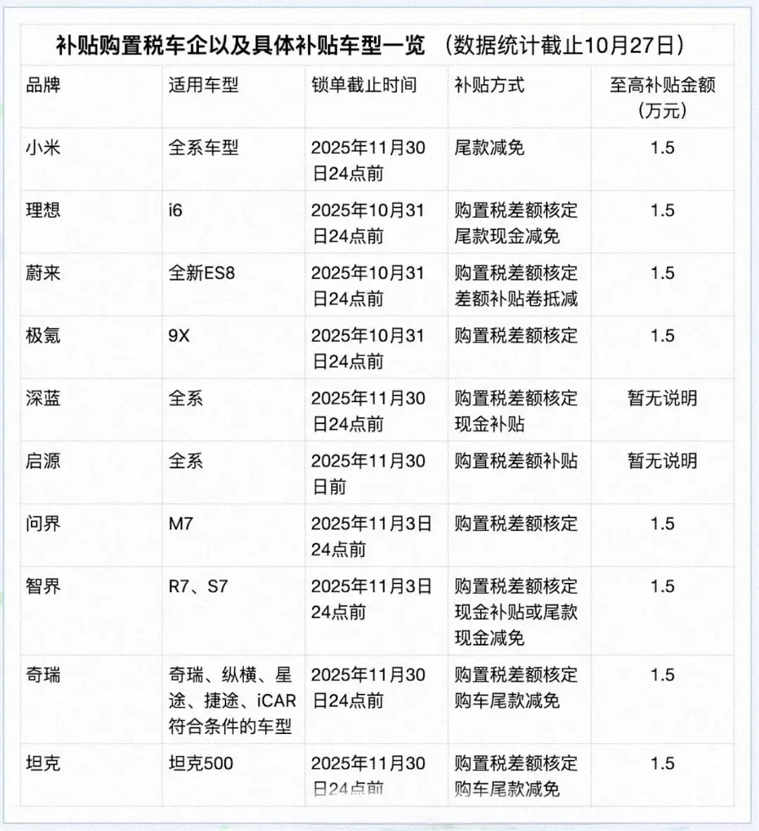 在2025年10月31日(含)前完成锁单的订单,若因最新原因需在2026年开票交付,用户可享受购置税差额补贴,补贴金额将直接从用户的车价尾款中扣除。