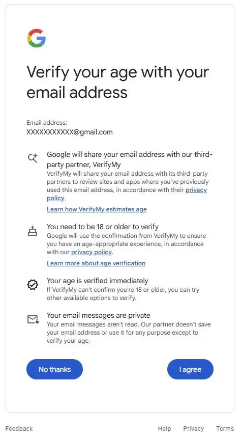 从曝光的界面截图可见,谷歌Play商店采用的全新年龄验证系统与YouTube现行方案如出一辙。当用户尝试下载某些特定应用时,系统会触发验证流程,提供多种认证方式供选择:可上传身份证件(驾照或护照等)、实时自拍验证、绑定信用卡信息,或选用第三方服务verifymy.io进行年龄核验。
