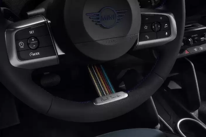 拉开车门走进内饰,首先映入眼帘的是方向盘上经典的Paul Smith彩色条纹织带和品牌铭牌,以低调地方方式,恰到好处地给驾驶者带来惊喜。