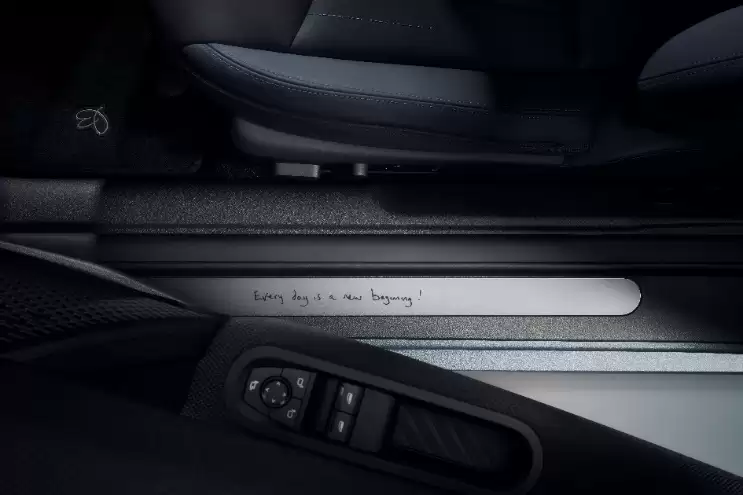 解锁车辆时,设计师手写体的“Hello”灯光投影映在地面,迎宾踏板板上印有Paul Smith的座右铭“Every day is a new beginning”,用每日“刷新”的仪式感,传递品牌乐观哲思。Paul Smith还将他的“幸运符”手绘兔子图案悄悄画在驾驶位的地垫上,埋下一颗温暖人心的幸运彩蛋。