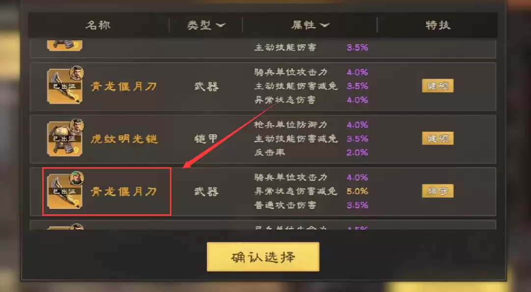 作为游戏中的金色品质武器,青龙偃月刀能有效提升骑兵单位的攻击力,同时附带主动技能免伤效果与异常状态伤害加成。作为金色装备,玩家在获取词条时不会出现紫色属性。该武器的单体异常状态免伤最高可达5%,骑兵单位攻击力加成上限同样为5%。