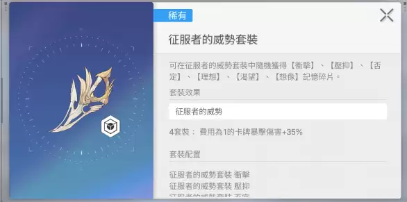 想要掌握装备系统,首先要了解它的核心规则。每个角色拥有6个装备槽,搭配时需要遵循“2件套+4件套”的组合逻辑。当前游戏共有12种套装效果,其中两件套效果无法叠加,所以选择时需要更加精准。这里先来说说提升核心输出的四件套搭配:如果你经常依赖一费卡牌打输出,那么征服者的威势套装就是理想选择。这套装备能将一费卡的暴击率直接提升35%。像雷欧娜这样依赖一费卡的英雄,穿上后输出能力将得到显著增强。