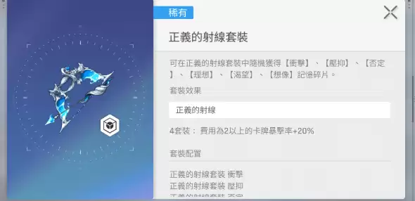 如果你偏爱使用两费及以上的卡牌,那就不该错过正义射线的套装效果,它能提供20%的暴击率加成,让高费卡的爆发更加稳定。此外,游戏还设有针对不同属性的专属套装,比如秩序阵营的弹匣套装,以及虚无阵营的禁品套装。使用这类套装可以直接强化对应属性的输出能力,针对特定敌人时表现尤为出色。两件套装备主要侧重基础属性加成或特殊增益,例如黑翼套装能提升12%的攻击力。想要堆高暴击伤害的话,可以选择提供25%爆伤的执行者道具套装。若是专注于辅助定位,则可以考虑带有12%生命上限加成的治愈者终极套装。