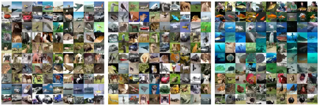 图注 1:Uni-Instruct 单步生成模型在不同基准数据集上的生成效果。左:CIFAR10(无条件生成);中:CIFAR10(有条件生成);右:ImageNet 64x64(有条件生成)。可以清晰看到,生成样本的质量和多样性都达到了出色水准。