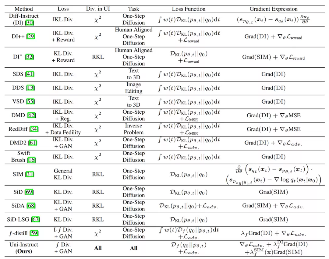 通过选择不同的 f-散度函数(如 KL 散度、卡方散度等),Uni-Instruct 能够复现出包括 Diff-Instruct[1]、DMD[2]、f-distill[5]、SIM[3]、SiD[4] 在内的十余种现有方法的损失函数。这不仅为理解现有工作提供了全新的高层视角,也标志着单步扩散模型理论体系走向统一。