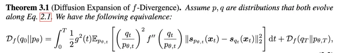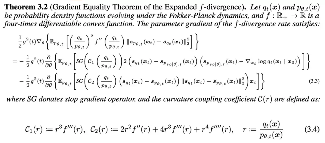 简单来说,该定理推广了 De Bruijin 等式,将静态的数据空间教师模型与单步生成模型之间的 f-散度展开为沿着扩散过程的动态散度积分。