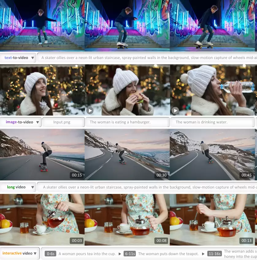 通过在视频续写任务上的预训练,该模型能够生成分钟级别的长视频,同时保持画面质量与时间连贯性。