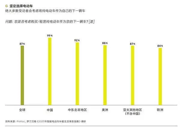 全球知名咨询机构罗兰贝格最新发布的《2025年智能电动车补能生态体系指数》指出,中国纯电动汽车市场展现出蓬勃的发展活力。这份基于2025年第二季度面向全球1.2万名消费者开展的问卷调研显示,高达99%的中国纯电车主表示未来购车时仍将选择纯电车型,这一数据充分印证了中国消费者对电动汽车的高度认可。