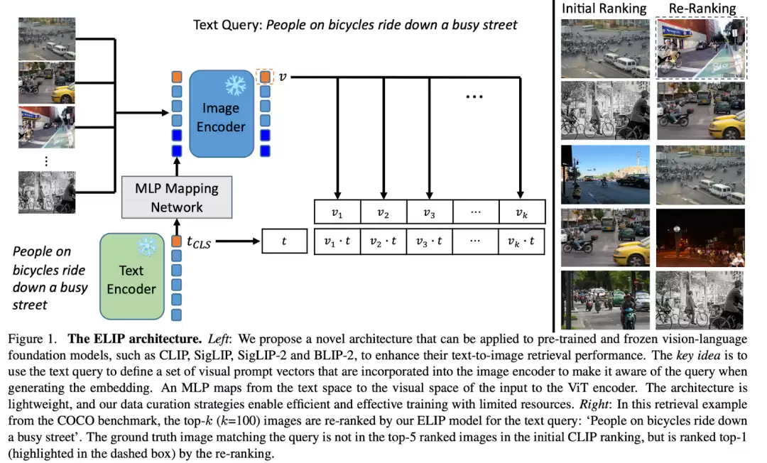 下图直观展示了ELIP方法的架构设计。该方法的核心理念在于采用两阶段检索机制:首先通过传统的CLIP/SigLIP模型进行初步排序,随后对候选样本进行精细化重排。