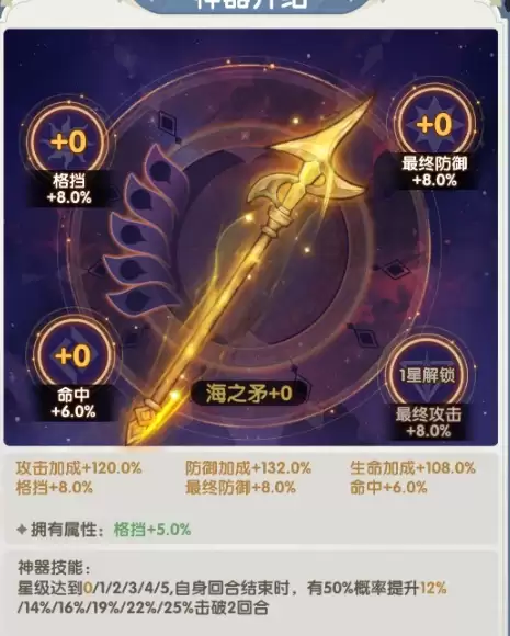 从属性面板来看,海之矛提供了攻击加成+120%、防御加成+132%、生命加成+108%,同时还附带最终防御+8%、格挡+8%、命中+6%。虽然这些加成数值单独看并不算特别突出,但却全面覆盖了输出与生存两大核心维度。