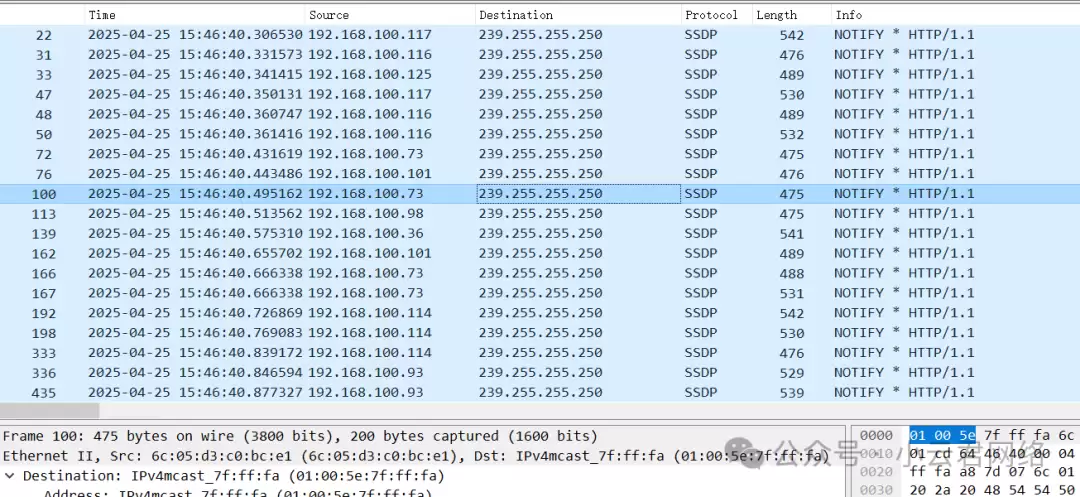 在有线侧直接抓包分析,发现存在大量SSDP协议报文。从源IP判断,这些报文均来自电子显示屏设备。据统计,每秒发送的报文数量高达200个: