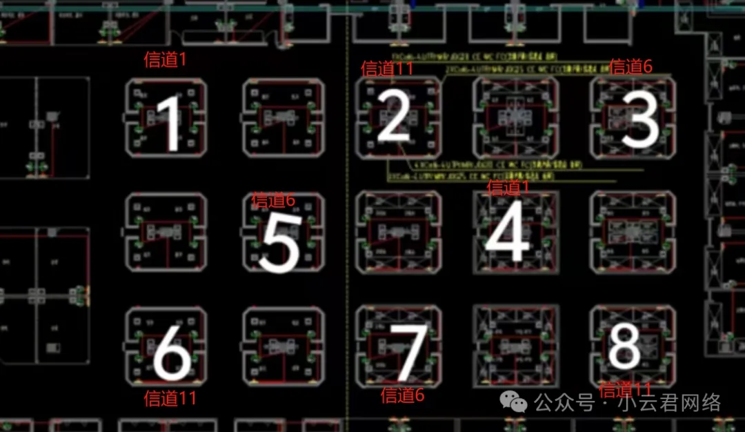 施工团队根据预设点位完成了AP部署和基础调试,具体点位与信道规划如图所示:
