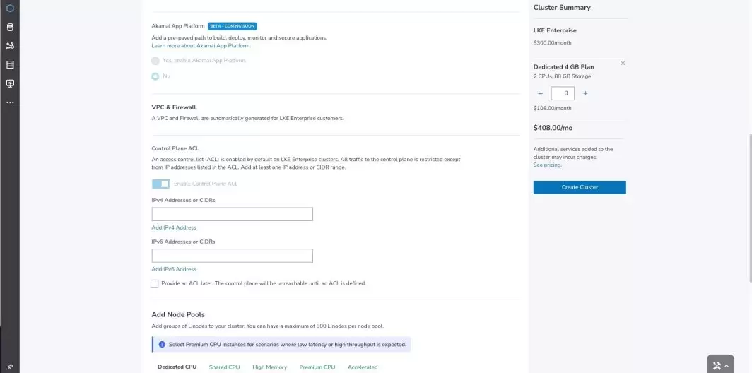 4. 与标准版LKE不同,高可用性(HA)、VPC和防火墙功能已在LKE企业版中自动集成。