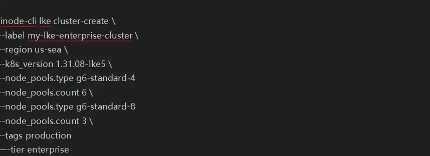4. 使用新增的--tier选项构建集群创建命令cluster-create,并指定"enterprise"层级。以下示例命令创建了名为"my-lke-enterprise-cluster"的LKE企业版集群,包含9个节点位于us-central区域: